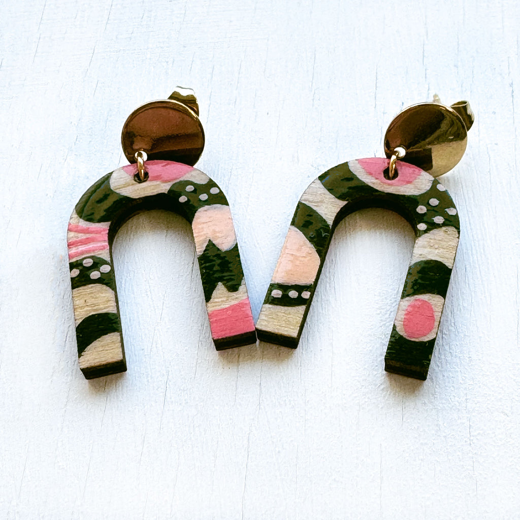 Pink and Dark Olive Green Hand-Painted Arch Wood Earrings