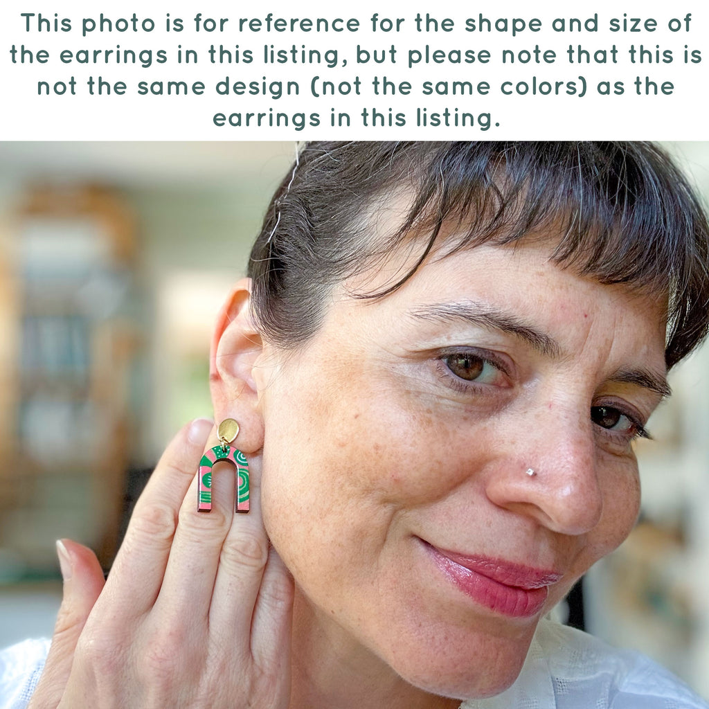 I paint these super fun earrings by hand in my small studio on the Outer Banks. They’re sealed with a protective varnish — but please don’t shower or swim with them. The arch is made of wood, and the stud (the part that goes through your ear) is gold-plated stainless steel — great for sensitive ears! I actually kept a pair for myself; I react to almost every metal except stainless steel, so I always test the settings I use first.